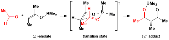 ホウ素エノラートの1位の置換基は遷移状態でaxial方向を向くため,アルデヒドの置換基は立体障害を避けるようにequatorial方向を向く。